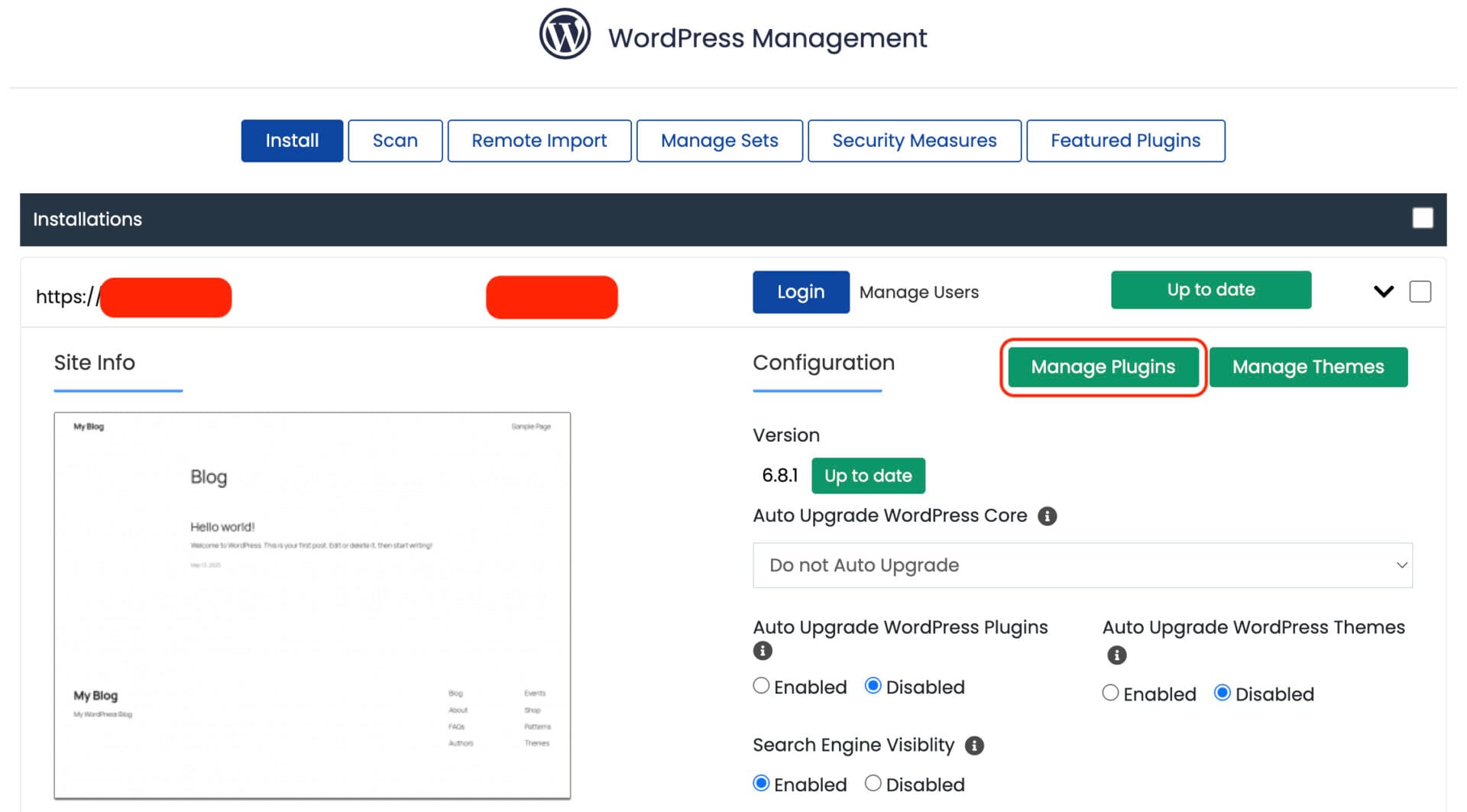 Setelah masuk, kamu akan melihat daftar instalasi WordPress di hosting kamu. Klik tombol Manage Plugins.