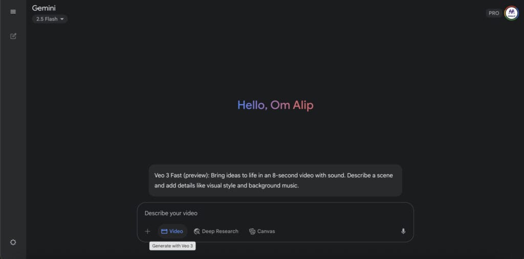 Tadi itu Om Alip lagi ngopi sambil buka Gemini AI, niatnya cuma iseng nyoba fitur-fitur barunya. Eh, ternyata ada menu baru nongol di bagian bawah: “Generate with Veo 3”.